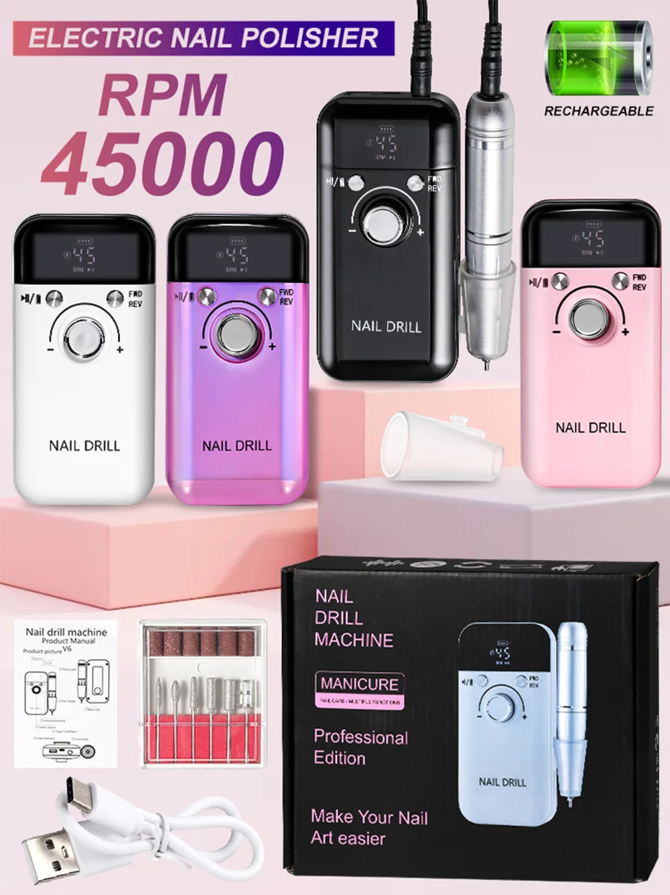 45000RPM Electric Nail Drill Polisher Rechargeable Portable Electric Nail File Machine Kit for Home Acrylic Gel Nails Polishing